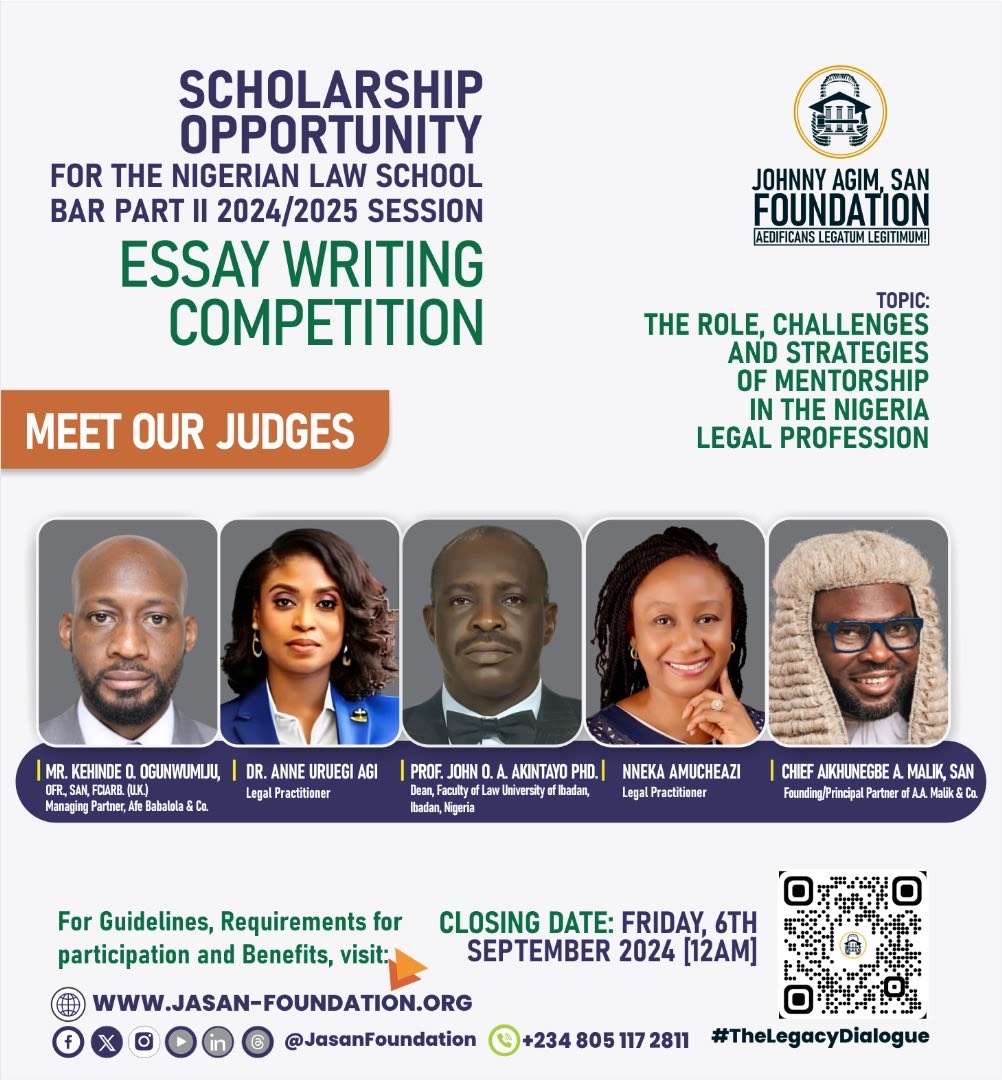 As part of the launch of the organisation, as well as “The Legacy Dialogue” and the inauguration of the #Legacy500 Elite Mentees, the Johnny Agim, SAN Foundation [JASAN Foundation] is organising an essay competition for the benefit of final year 500 Level Law Students of all Law Faculties of Federal and State Universities across the Federation. Therefore, interested 500 Level / Final Year Law Students are invited to write an essay as well as provide a short video recording on the topic: