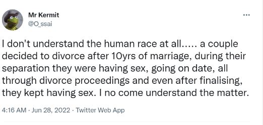 ”I don’t understand the human race at all….. a couple decided to divorce after 10yrs of marriage, during their separation they were having s3x, going on dates, all through divorce proceedings and even after finalising, they kept having s3x. I no come understand the matter.”