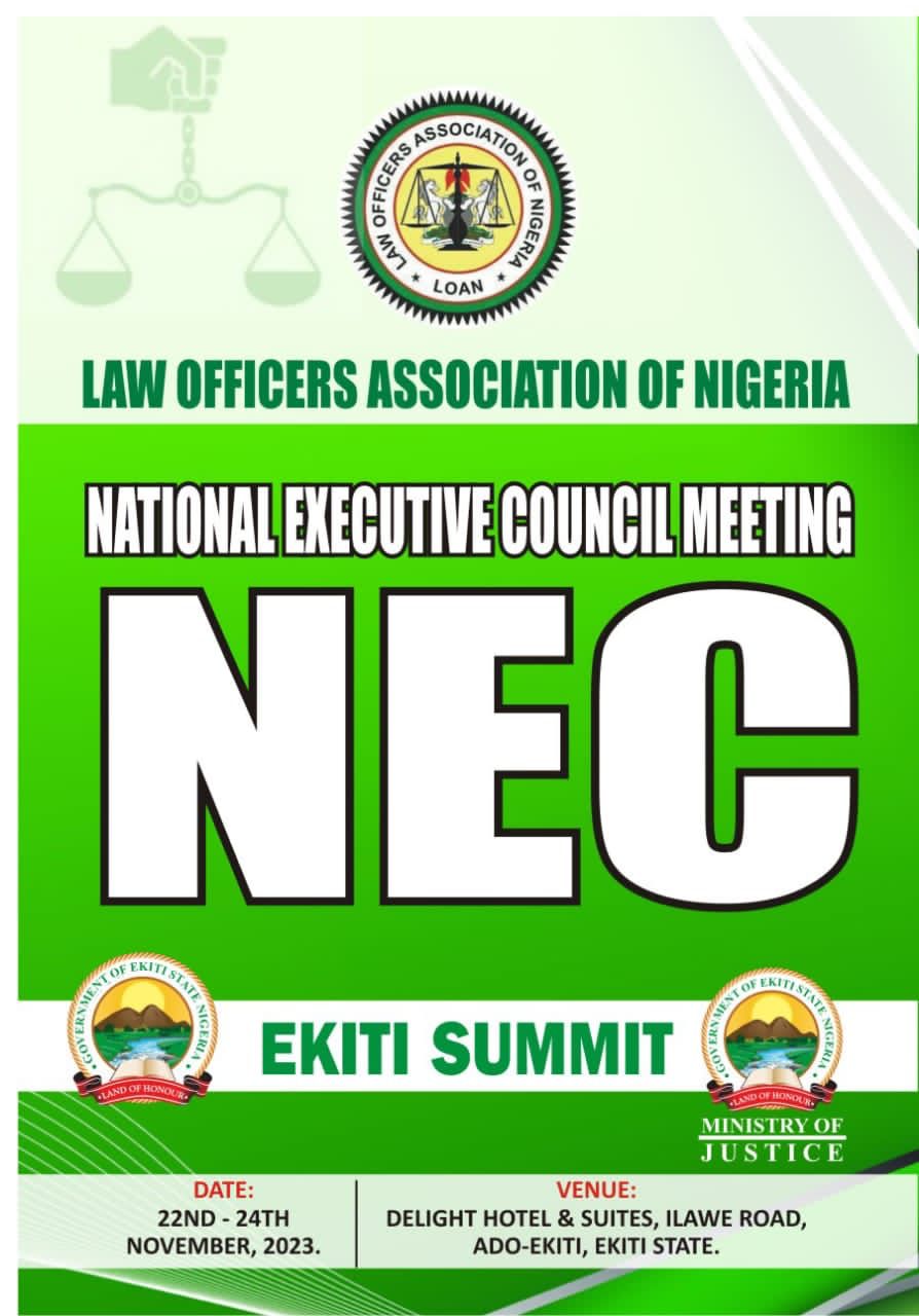 I extend my warmest greetings to the Law Officers Association of Nigeria as you convene for the National Executive Council Meeting in Ekiti State from November 22nd to 24th, 2023. Your dedication to upholding justice and the rule of law is commendable, and this gathering reflects your commitment to advancing legal excellence.