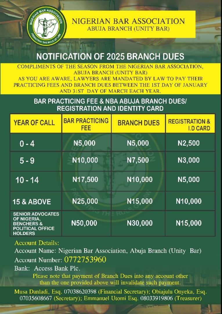 The Nigerian Bar Association (NBA) Abuja Branch, also known as the Unity Bar, has issued a notice regarding the payment of 2025 branch dues.