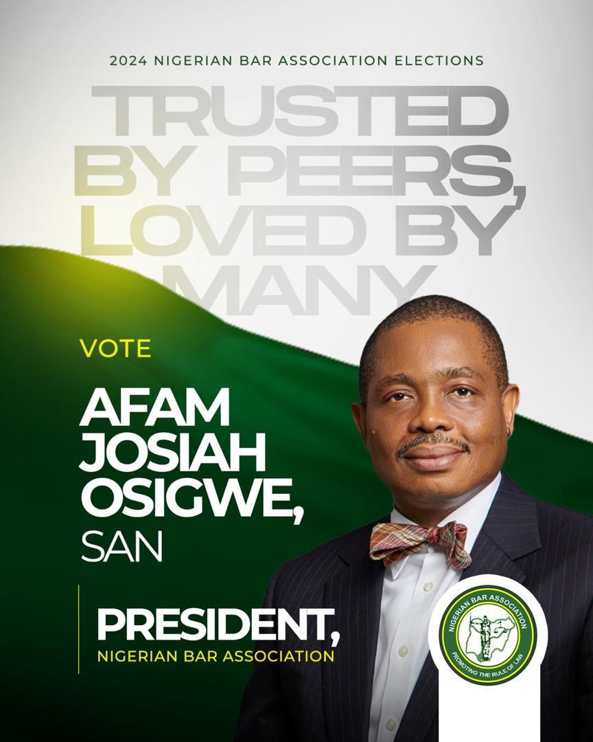 Let me use this opportunity to request our collective support and vote for Mazi Afam Josiah Osigwe, SAN, as the President of the Nigerian Bar Association (NBA) in the forthcoming election slated for July 20, 2024.